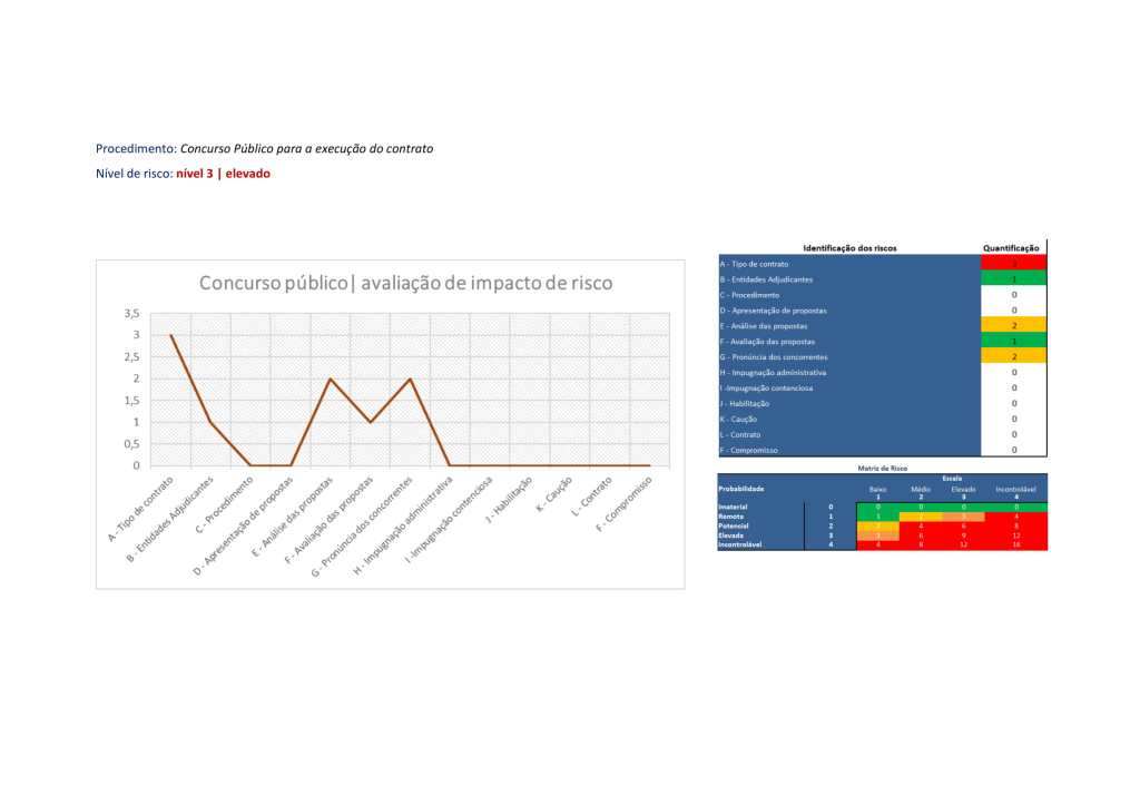 Definido o modelo de análise de risco, pode o mesmo facilmente ser aplicado a cada caso concreto, permitindo preencher a matriz para a análise de risco e construir, progressivamente, a avaliação de impacto de risco do procedimento, oferecendo informação de gestão adequada a replanear a atividade, se necessário, ou para consideração de soluções de gestão alternativas, como se exemplifica:
