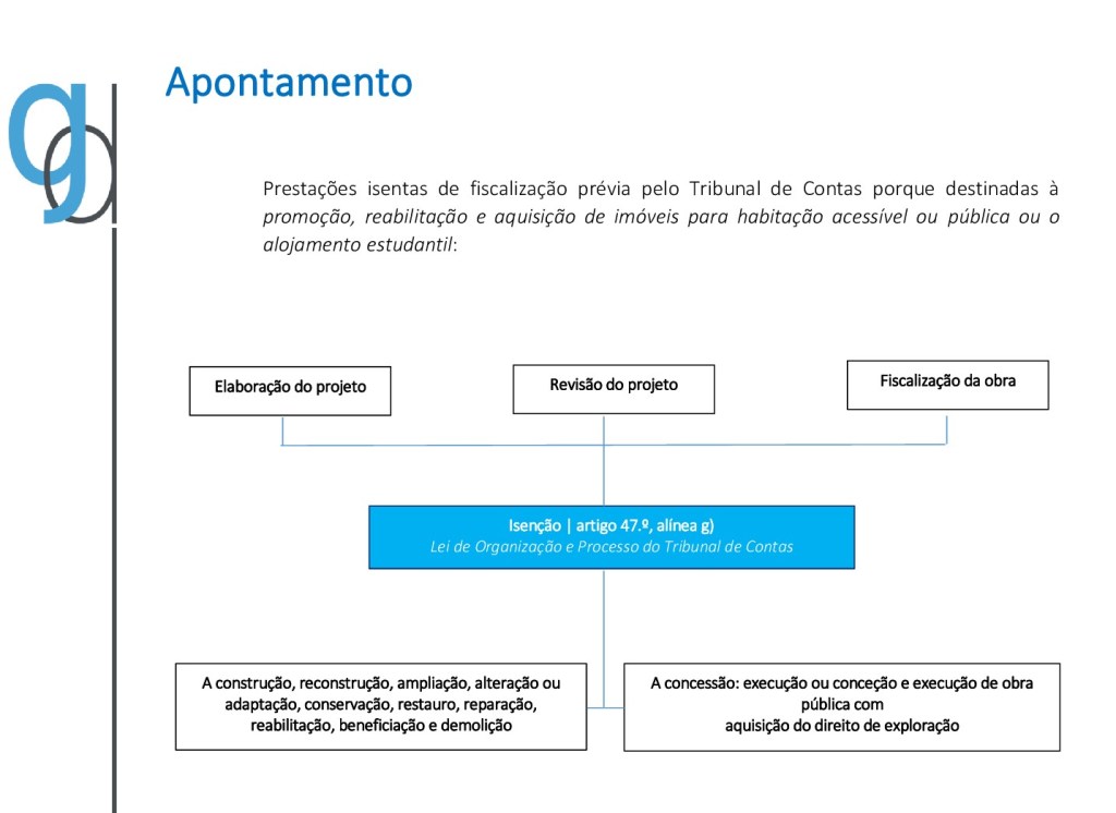 – Os atos, contratos ou outros instrumentos jurídicos que tenham por objeto a aquisição de serviços de elaboração do projeto, revisão do projeto, fiscalização de obra, empreitada e concessão destinados à promoção, reabilitação e aquisição de imóveis para habitação acessível ou pública ou o alojamento estudantil estão isentos de fiscalização prévia do Tribunal de Contas.