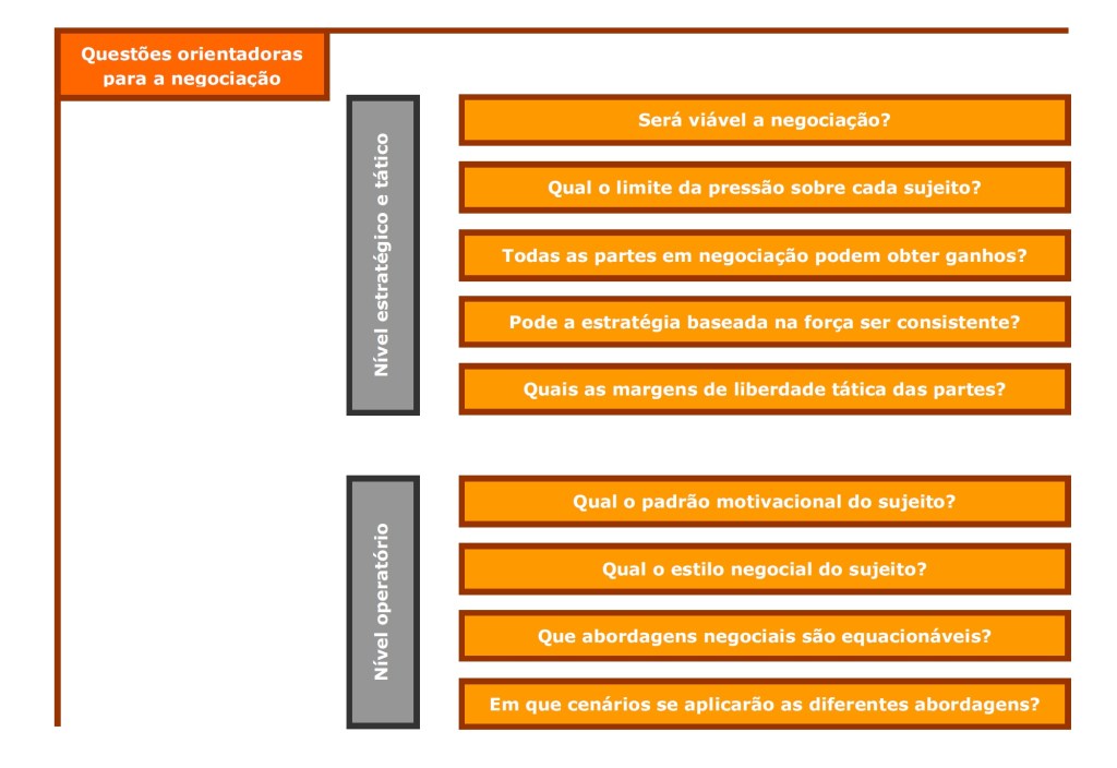 As questões orientadoras para a negociação colocam-se, então, tanto no plano estratégico e tático, como no plano operatório.