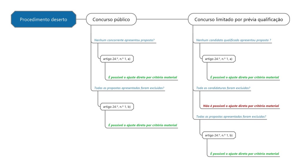 Assim, da atual conjugação das alíneas a) e b) do n.º 1 do artigo 24.º do Código dos Contratos Públicos resulta que o recurso ao ajuste direto não é possível na hipótese de o procedimento – sendo um concurso limitado por prévia qualificação – ter ficado deserto simplesmente por todas as candidaturas apresentadas terem sido excluídas.